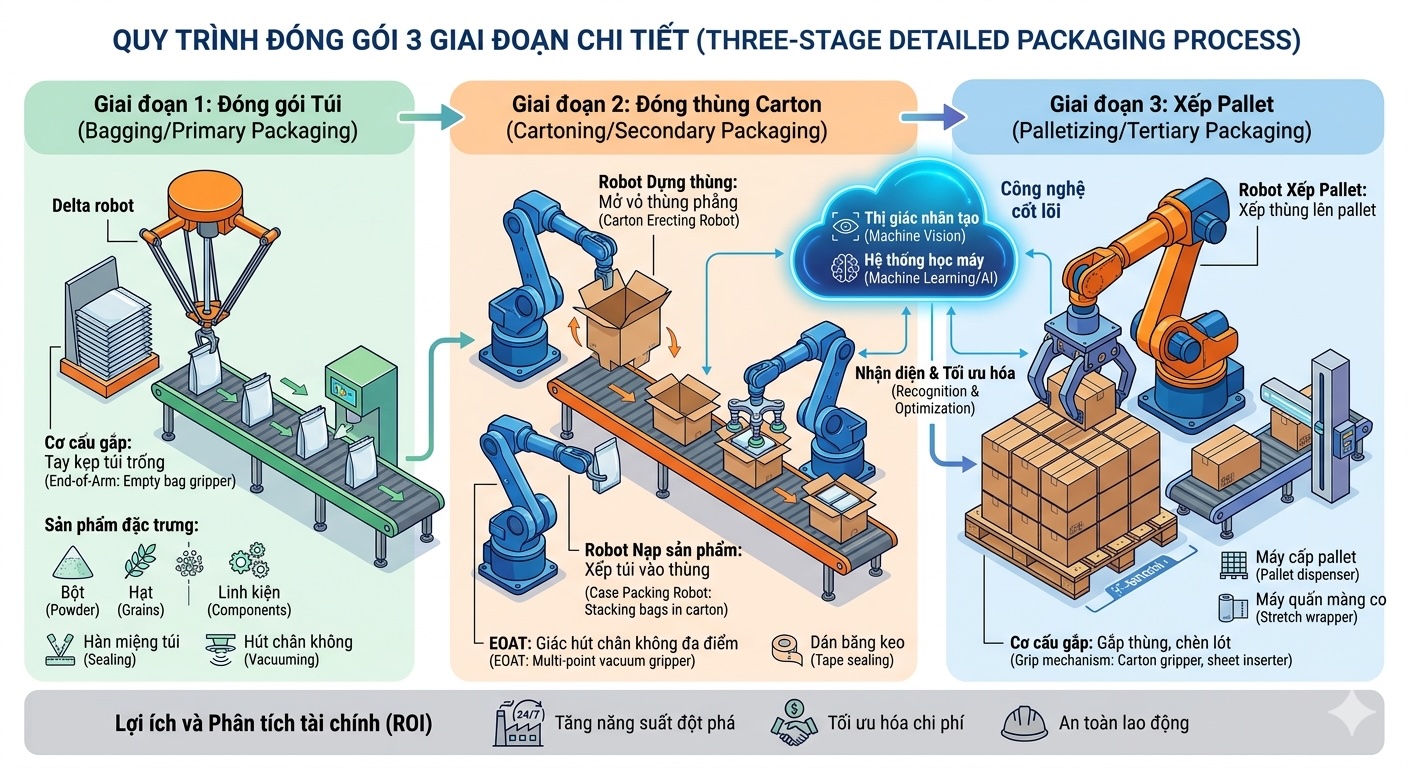 Quy trình hoạt động của hệ thống robot đóng gói tự động cho túi, thùng carton, pallet