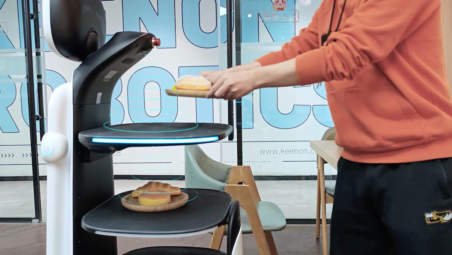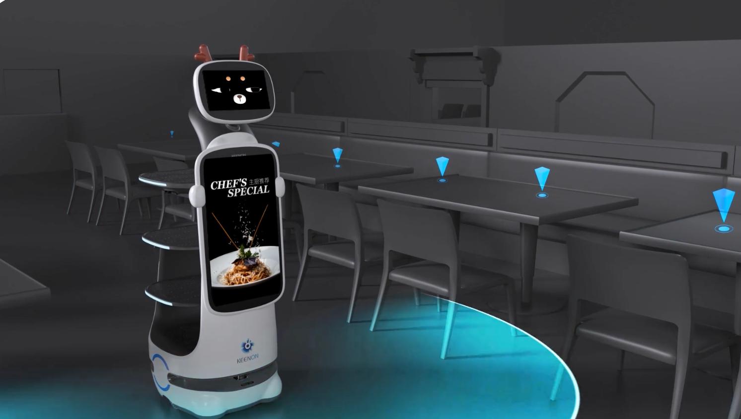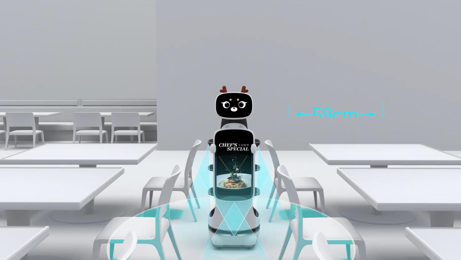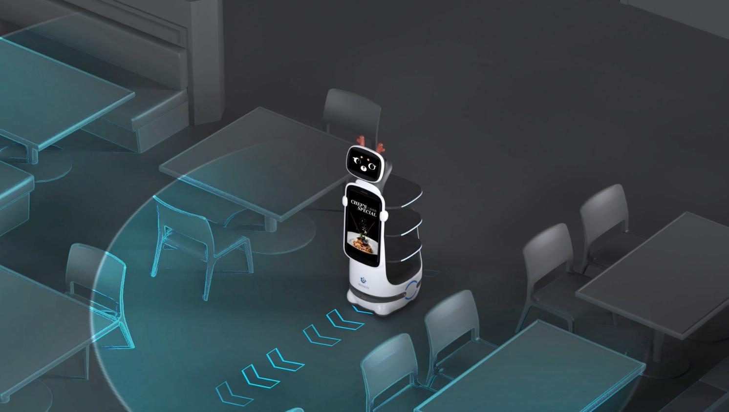 - Robot có khả năng di chuyển thông minh, tránh chướng ngại vật, phù hợp với không gian đông người như sảnh khách sạn, nhà hàng hay khu buffet.