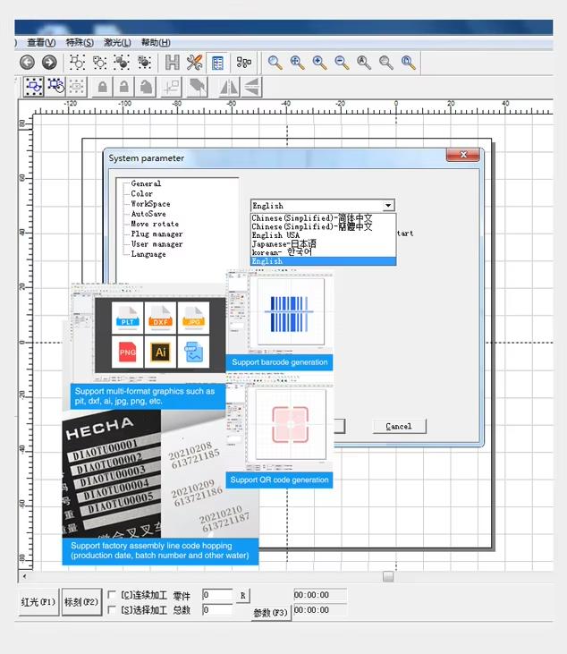 - Phần mềm EZCAD chính hãng, dễ sử dụng: Hỗ trợ đa ngôn ngữ, tương thích nhiều định dạng đồ họa như AI, PLT, DXF, BMP, JPG, PNG, thuận tiện cho thiết kế và chỉnh sửa.
