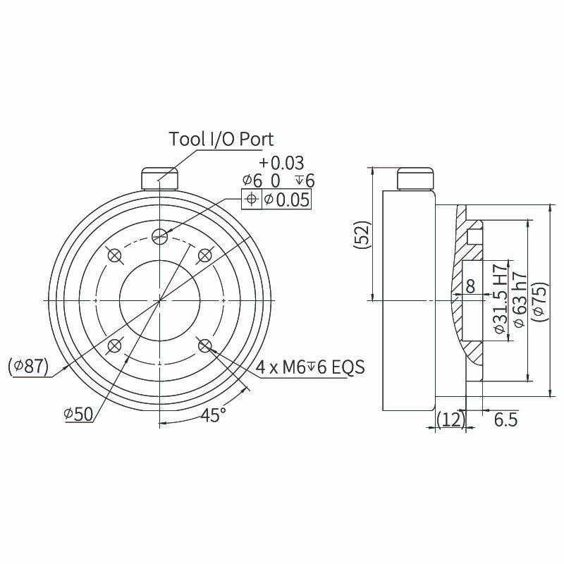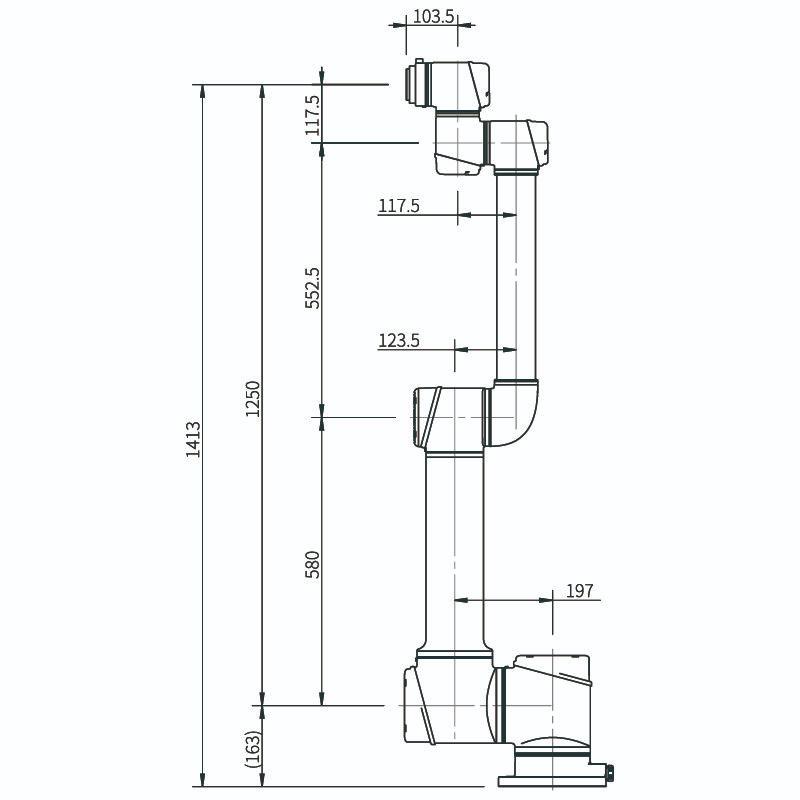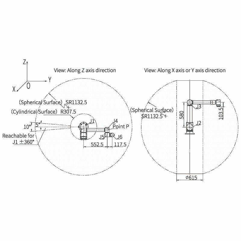 Mỗi khớp có khả năng quay ±360°. Tuy nhiên, tùy theo kịch bản ứng dụng và không gian lắp đặt, một số góc hoặc vị trí của các khớp có thể không tiếp cận được trong quá trình vận hành thực tế.